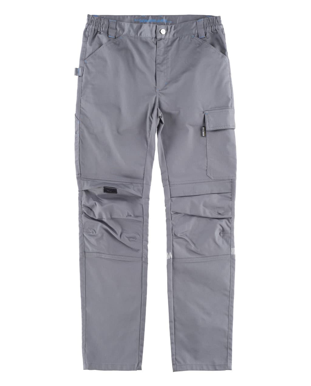 Pantalón de tejido elástico bidireccional por construcción. Dos bolsos de abertura inclinada en los costados y un bolso lateral de plastón y cartera de velcro. Dos bolsos traseros de plastón y cartera de velcro. Un bolso de espátula doble en pernera. Refuerzo con cartera de velcro para rodilleras de protección. Trabilla porta martillo. Presillas a contraste. Elástico en los laterales de la cintura. Trabillas. Cinta reflectante decorativa personalizada en pernera. Cierre de botón metálico y bragueta de cremallera.