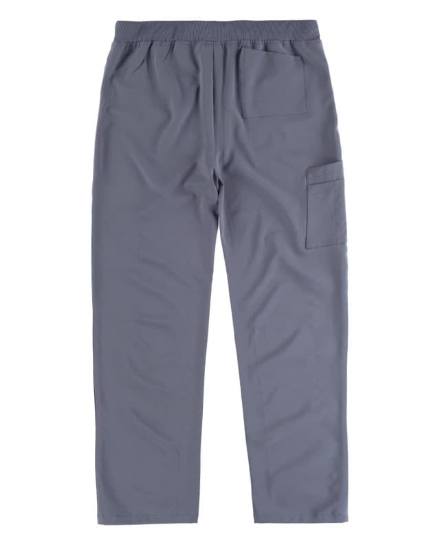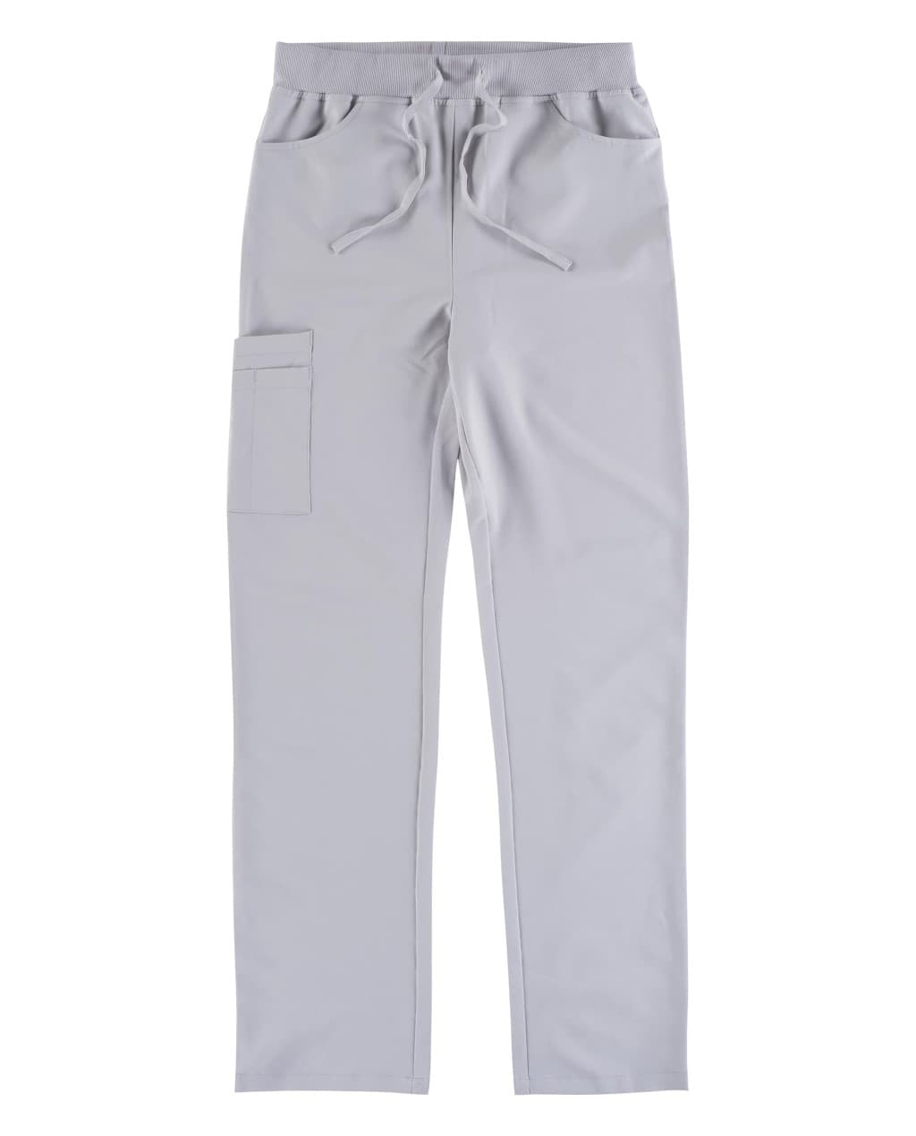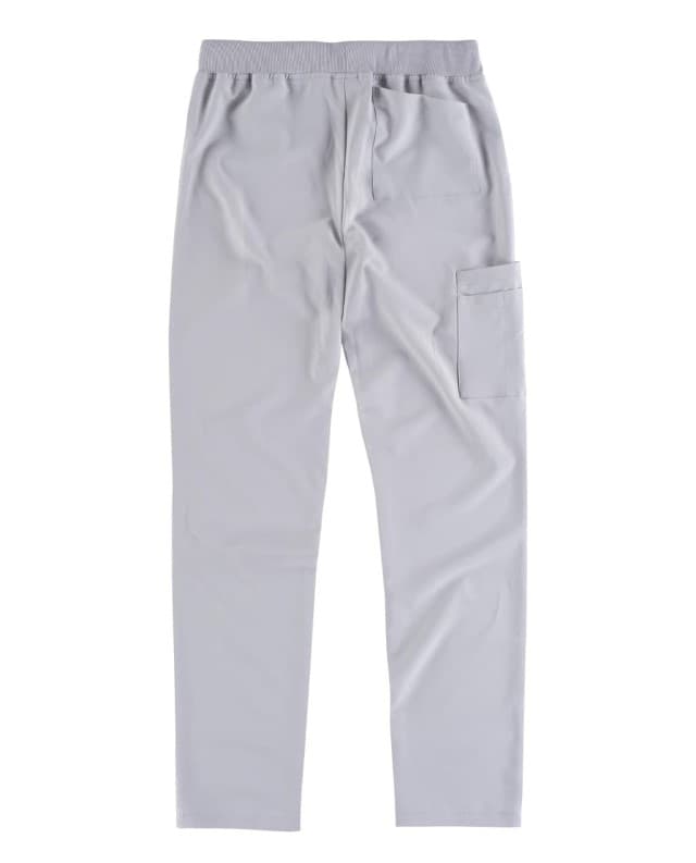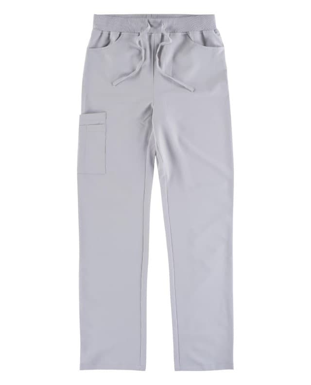 Pantalón con tejido elástico. Dos bolsos de abertura redondeada en los costados. Un bolsillo trasero de plastón. Un bolso doble de plastón en pernera. Bolsillos para bolígrafos. Elástico en la cintura y ajuste de cordón.