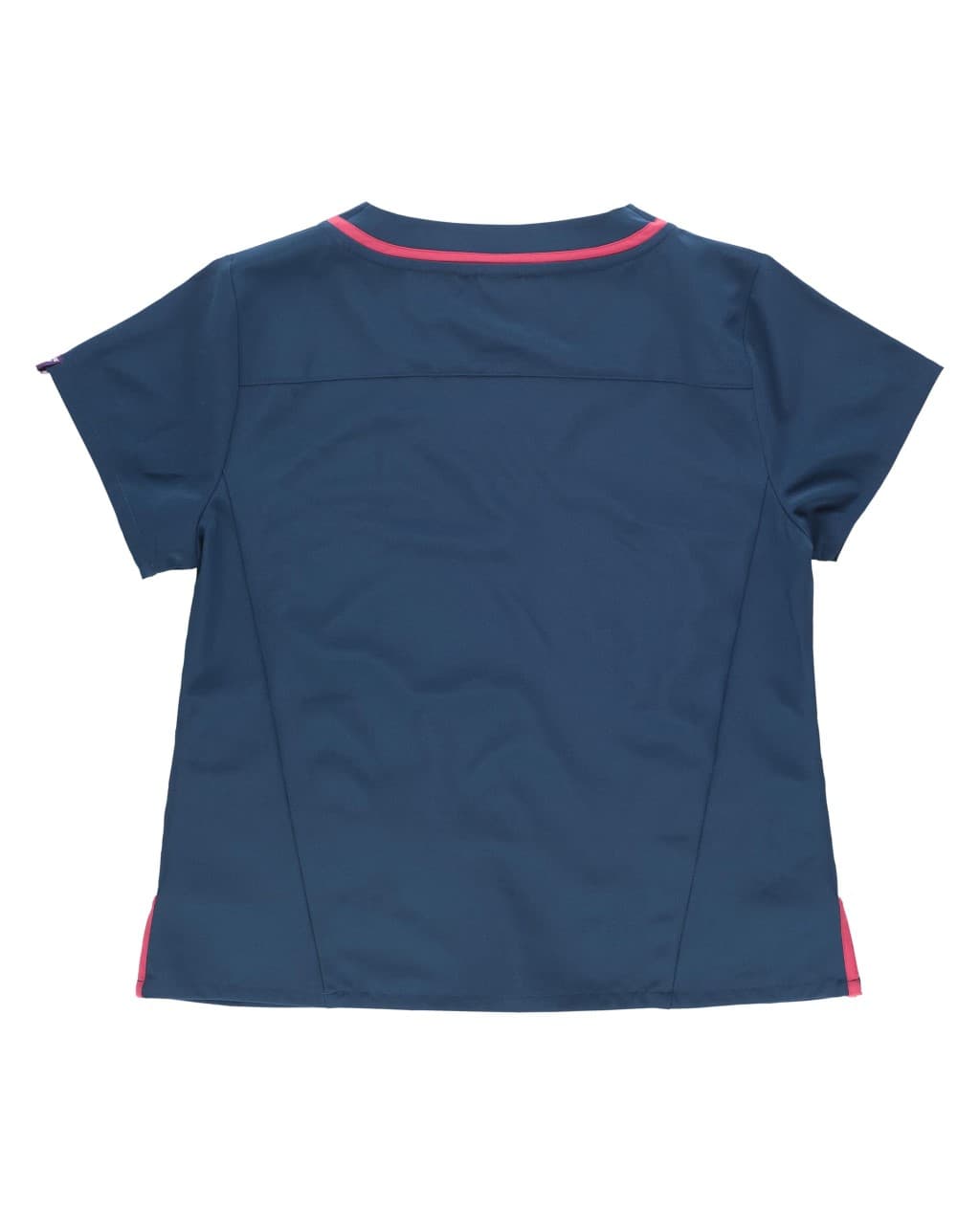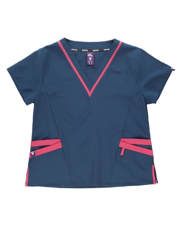Casaca de señora combinada, de manga corta con tejido elástico. Cuello a pico combinado. Dos bolsillos dobles en los laterales y trabilla. Aberturas en los costados.