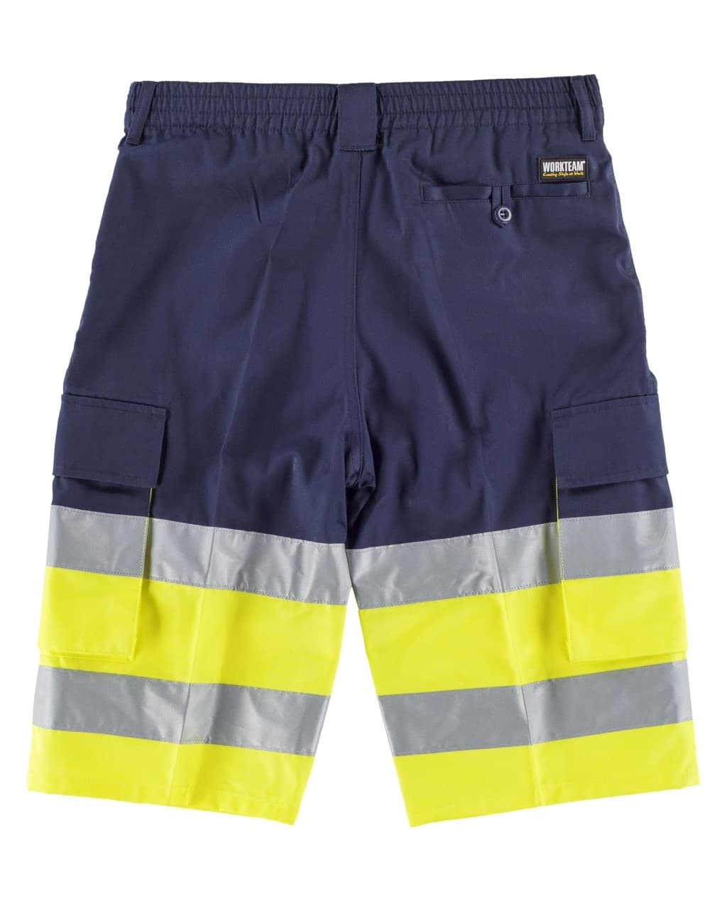 Bermuda combinada con alta visibilidad y cintas reflectantes. Dos bolsos de abertura inclinada en los costados. Dos bolsos laterales con cinta reflectante, fuelle y cartera de velcro. Un bolso trasero de ojal con cierre de presilla y botón. Dos cintas reflectantes en perneras. Parte inferior de alta visibilidad. Elástico en cintura. Trabillas. Cierre de botón y bragueta de cremallera.