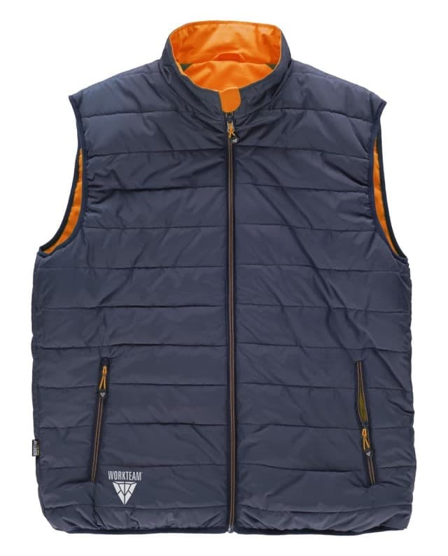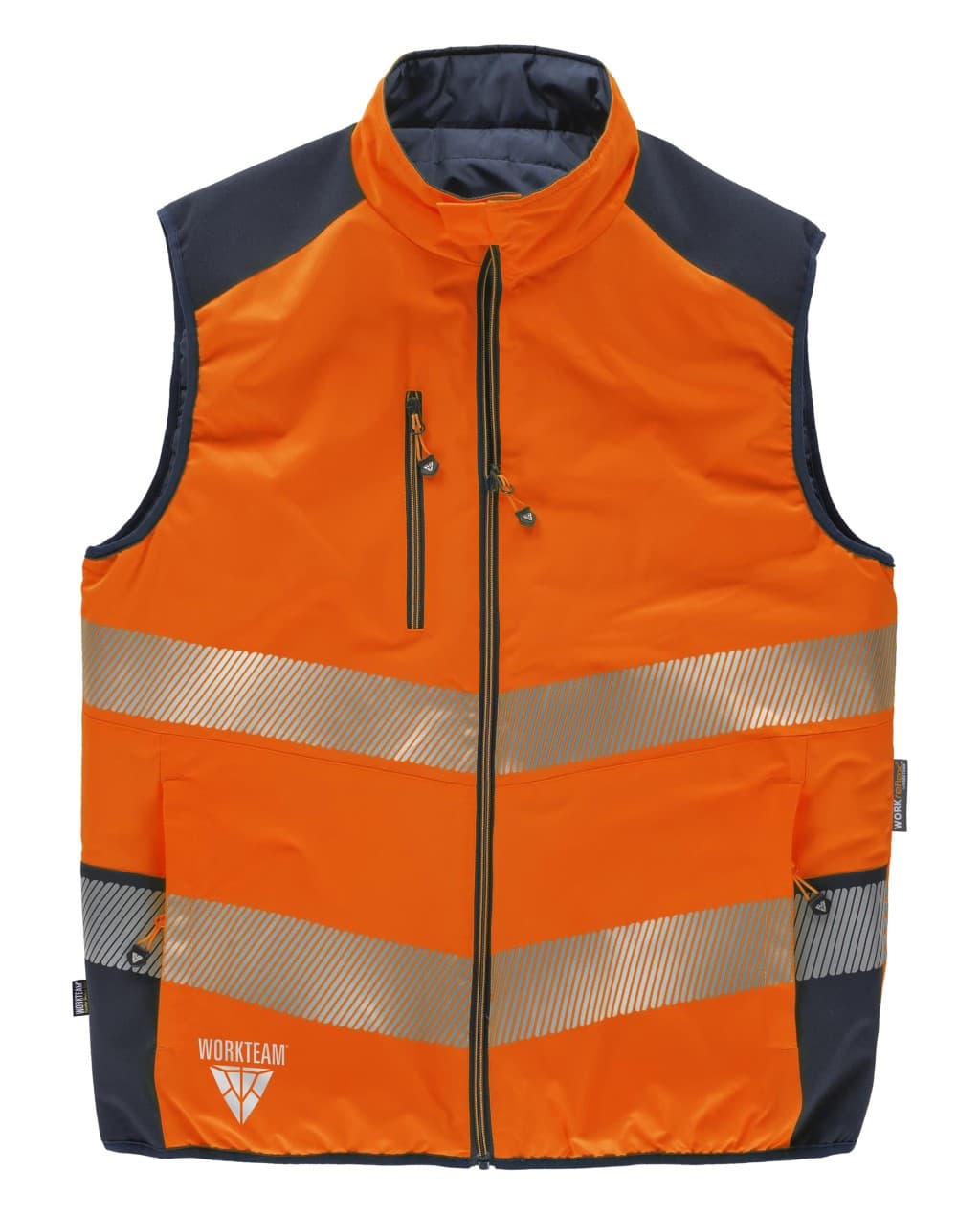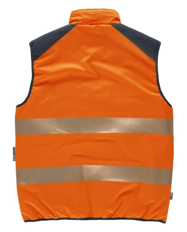 Chaleco reversible acolchado. Cuello alto con cierre de cremallera de nylon. Solapa protectora cubriendo la cremallera. Ribeteado con bies elástico a contraste. Exterior: Combinado con alta visibilidad y cintas reflectantes segmentadas. Dos bolsos laterales interiores con cierre de cremallera. Un bolso de pecho interior con cierre de cremallera. Dos cintas reflectantes segmentadas termoadhesivas en pecho y espalda. Colgador en la parte trasera del cuello. Interior: Acolchado pespunteado. Dos bolsos laterales interiores con cierre de cremallera.