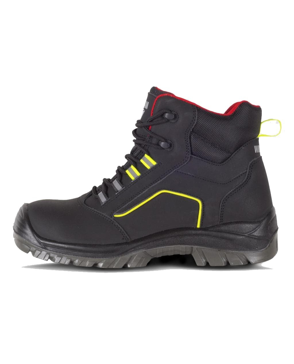 Bota de piel de nobuk con cordones. Libre de metal. Detalles reflectantes y de alta visibilidad. Suela PU bidensidad combinada en dos colores. Trabilla para tirar en la parte superior del talón para mayor comodidad al ponérsela. Puntera de composite anti impactos y plantilla textil antiperforación. Propiedades antiestáticas. Absorción de la energía en la zona del tacón. Resistente a los hidrocarburos, a la penetración y la absorción del agua. Resistente a la perforación. Suela con resaltes. Resistente al deslizamiento sobre baldosa cerámica con disolución de jabón y sobre acero con glicerina. S3 SRC.