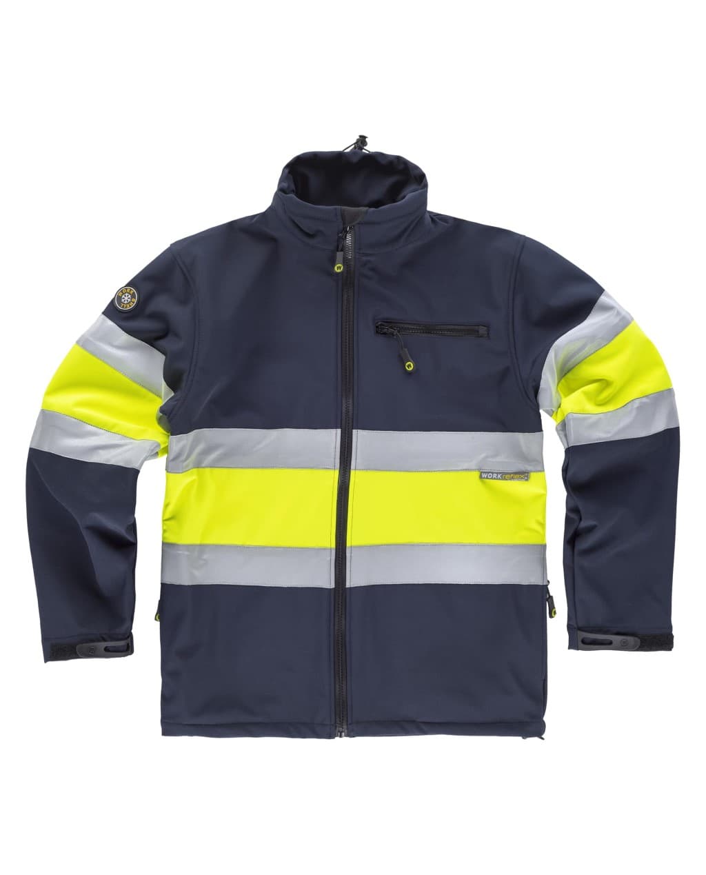Chaqueta Workshell combinada con cintas reflectantes. Cuello alto y cierre de cremallera. Solapa protectora interior vuelta en la parte superior cubriendo la cremallera. Un bolso de pecho y dos laterales interiores con cremallera. Dos cintas reflectantes en pecho, espalda y mangas con pieza central de alta visibilidad. Bocamanga ajustable con velcro. Cordón elástico con pieza ajustable en cuello y bajo. Tejido corta vientos, repelente al agua y resistente al desgarro con membrana interior transpirable y aislante e interior de alta capacidad térmica.