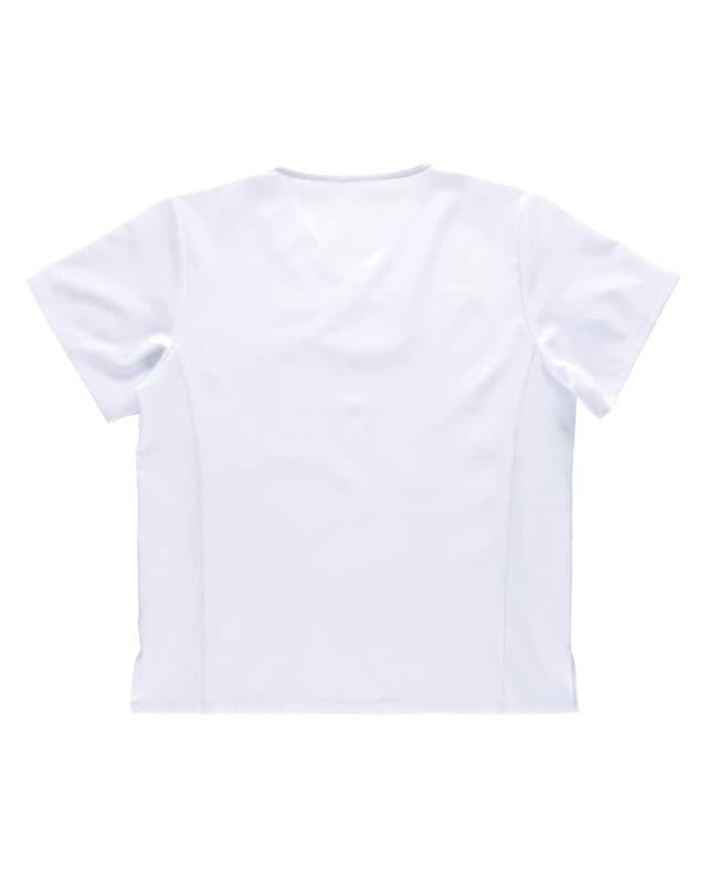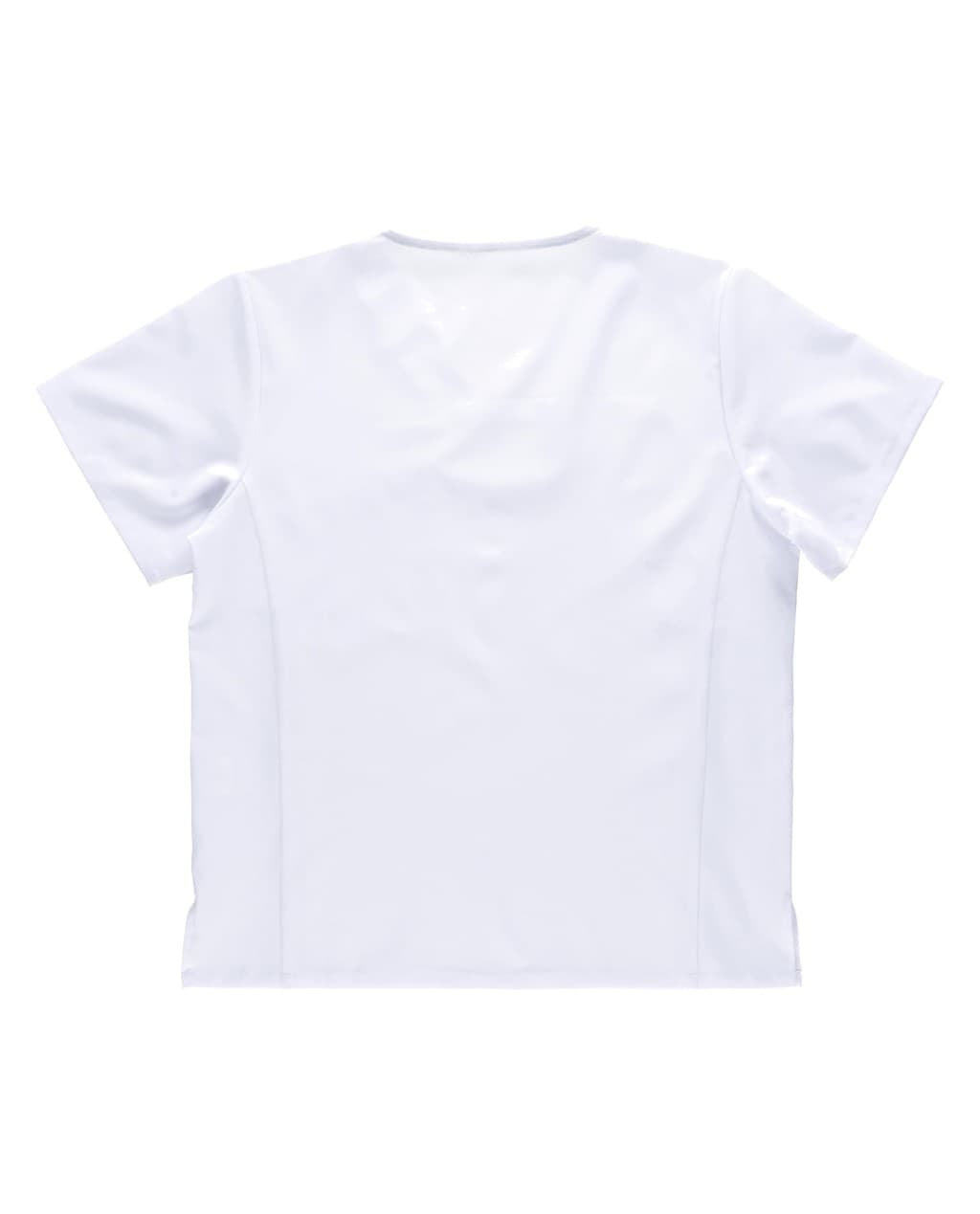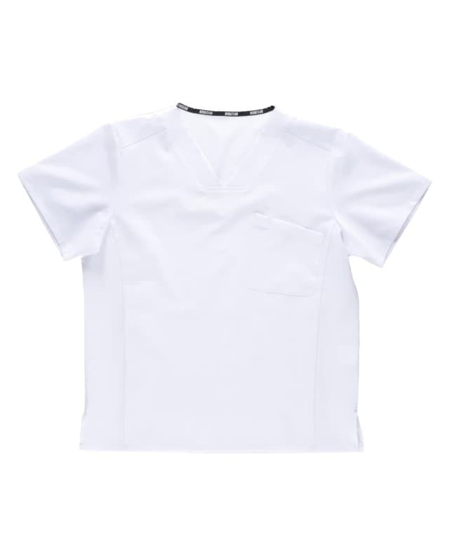 Casaca unisex de manga corta con tejido elástico. Cuello a pico. Un bolsillo en pecho de plastón. Un bolsillo para bolígrafos. Aberturas en los costados.