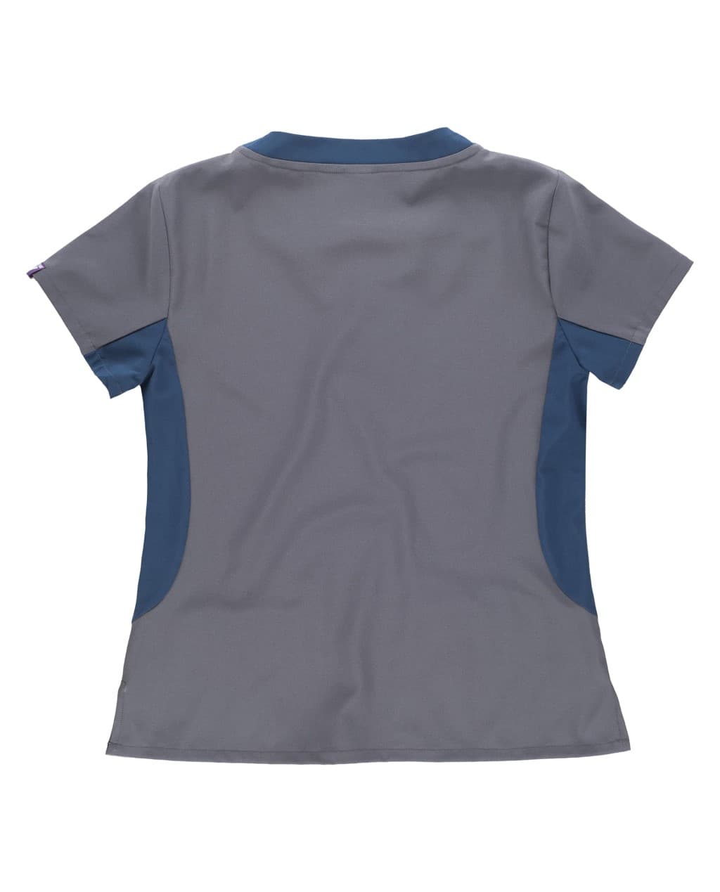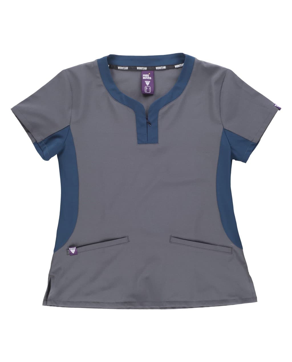 Casaca de señora combinada, de manga corta con tejido elástico. Cuello redondo con cremallera. Dos bolsillos interiores laterales. Aberturas en los costados.