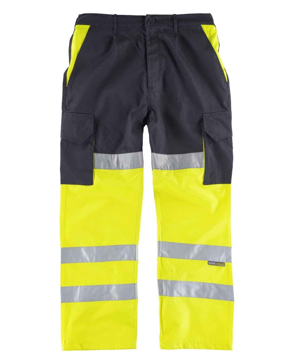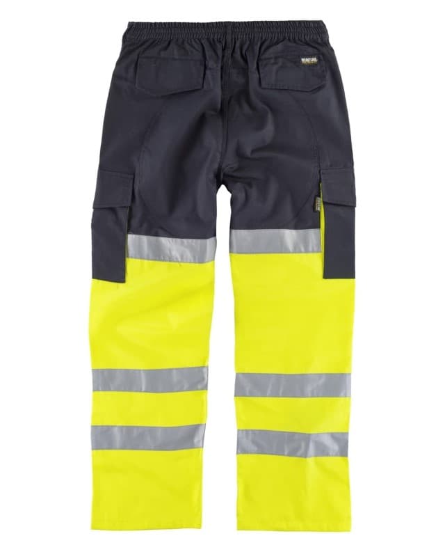 Pantalón con refuerzos combinado con alta visibilidad y cintas reflectantes. Dos bolsos de abertura inclinada en los costados, dos bolsos laterales de fuelle con cartera de pico y velcro. Dos bolsos traseros interiores con cartera de pico y velcro. Refuerzo en culera. Tres cintas reflectantes en perneras. Elástico en la cintura. Trabillas. Cierre de botón y bragueta de cremallera.