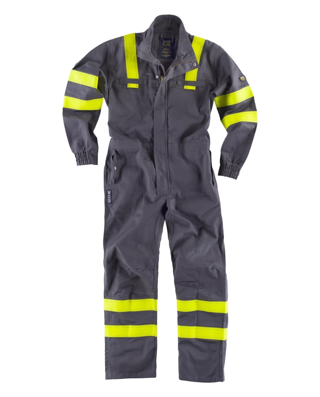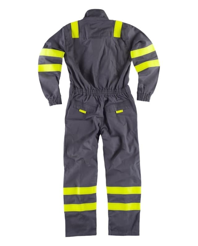 Buzo para soldador, ignífugo y antiestático de triple costura. Cuello alto y cierre de cremallera de metal de doble tirador y corchetes ocultos por solapa postiza. Dos bolsos de pecho, dos bolsos laterales y dos bolsos traseros, todos de ojal con carteras de seguridad y cierre de corchete. Una cinta fluorescente amarilla ignífuga en hombros y dos en mangas y perneras. Puño con elástico. Canesú y elástico en la espalda.