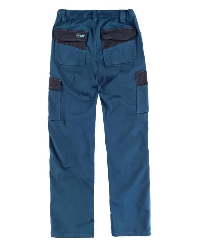 Pantalón combinado de tejido elástico. Dos bolsos de carga en los costados con bolsos superpuestos. Un bolso lateral de carga con cartera de velcro y otro de espátula doble. Dos bolsos traseros de plastón y cartera de velcro. Refuerzo con cierre de velcro para rodilleras de protección. Elástico en los laterales de la cintura. Trabillas. Cierre de botón metálico y bragueta de cremallera metálica.