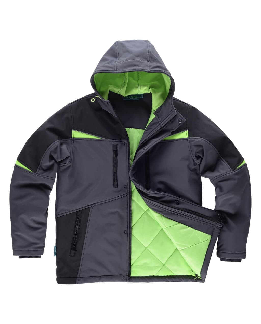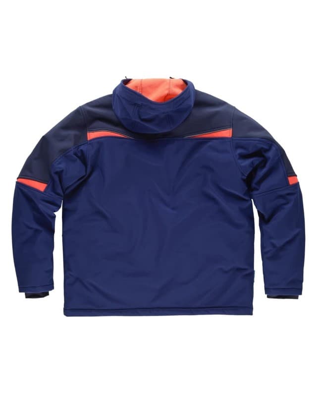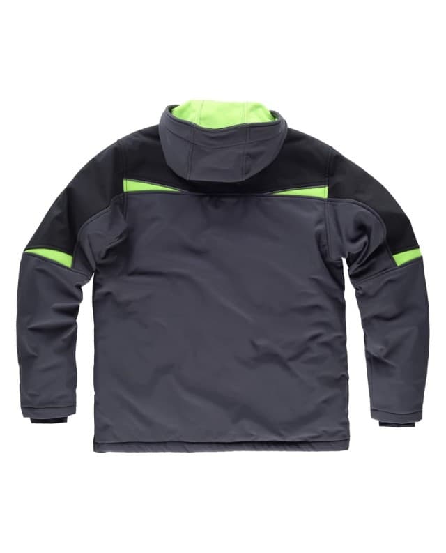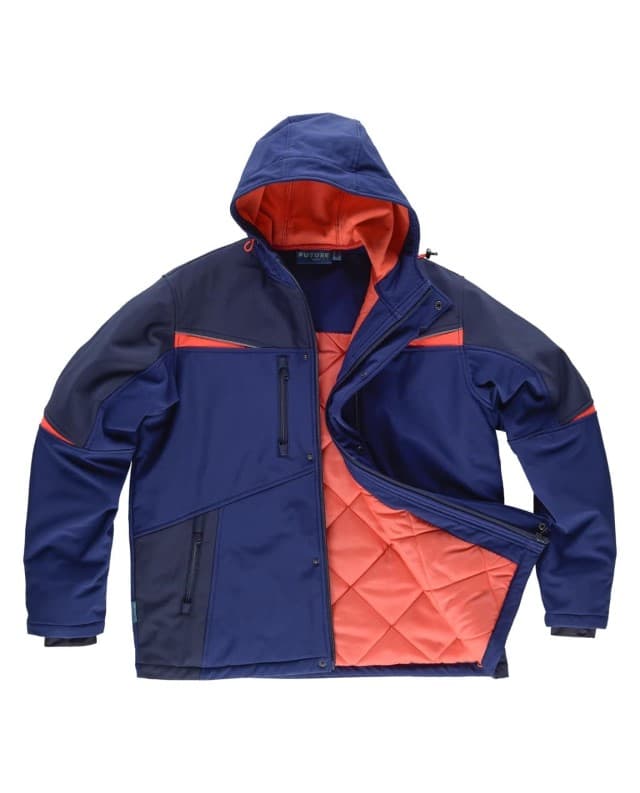 Chaqueta Workshell acolchada, tricolor, con detalles reflectantes y canesús. Cuello alto y capucha con cordón para ajustar. Cierre de cremallera de nylon de doble tirador oculta por solapa postiza con corchetes ocultos. Dos bolsos de pecho y dos laterales interiores con cierre de cremallera. Mitones interiores con abertura para el pulgar. Cordón elástico con pieza ajustable en el bajo. Tejido corta vientos, repelente al agua y resistente al desgarro con membrana interior transpirable y aislante e interior de alta capacidad térmica reforzada con una capa acolchada interior.