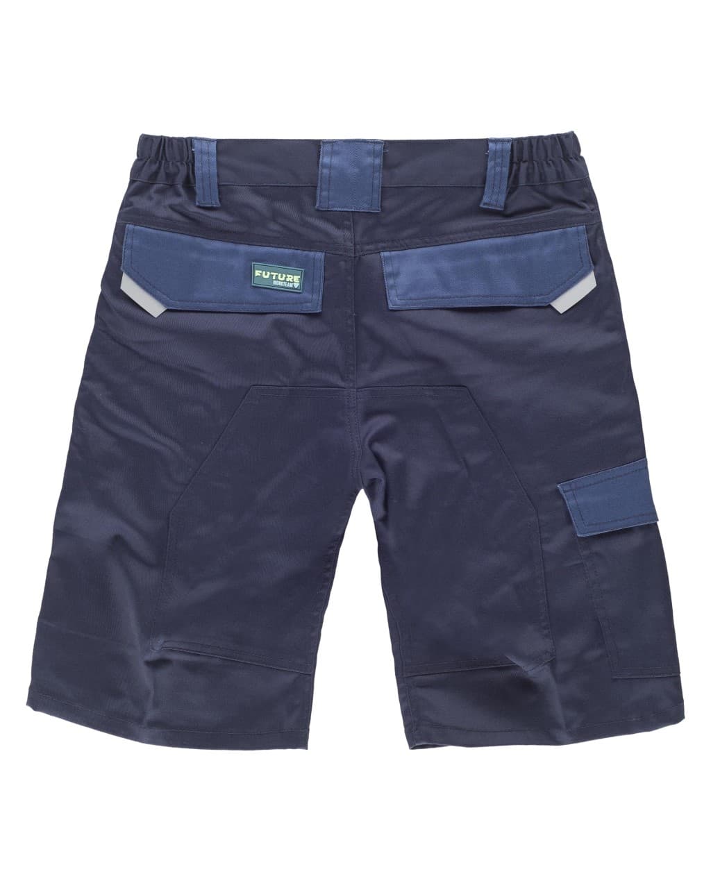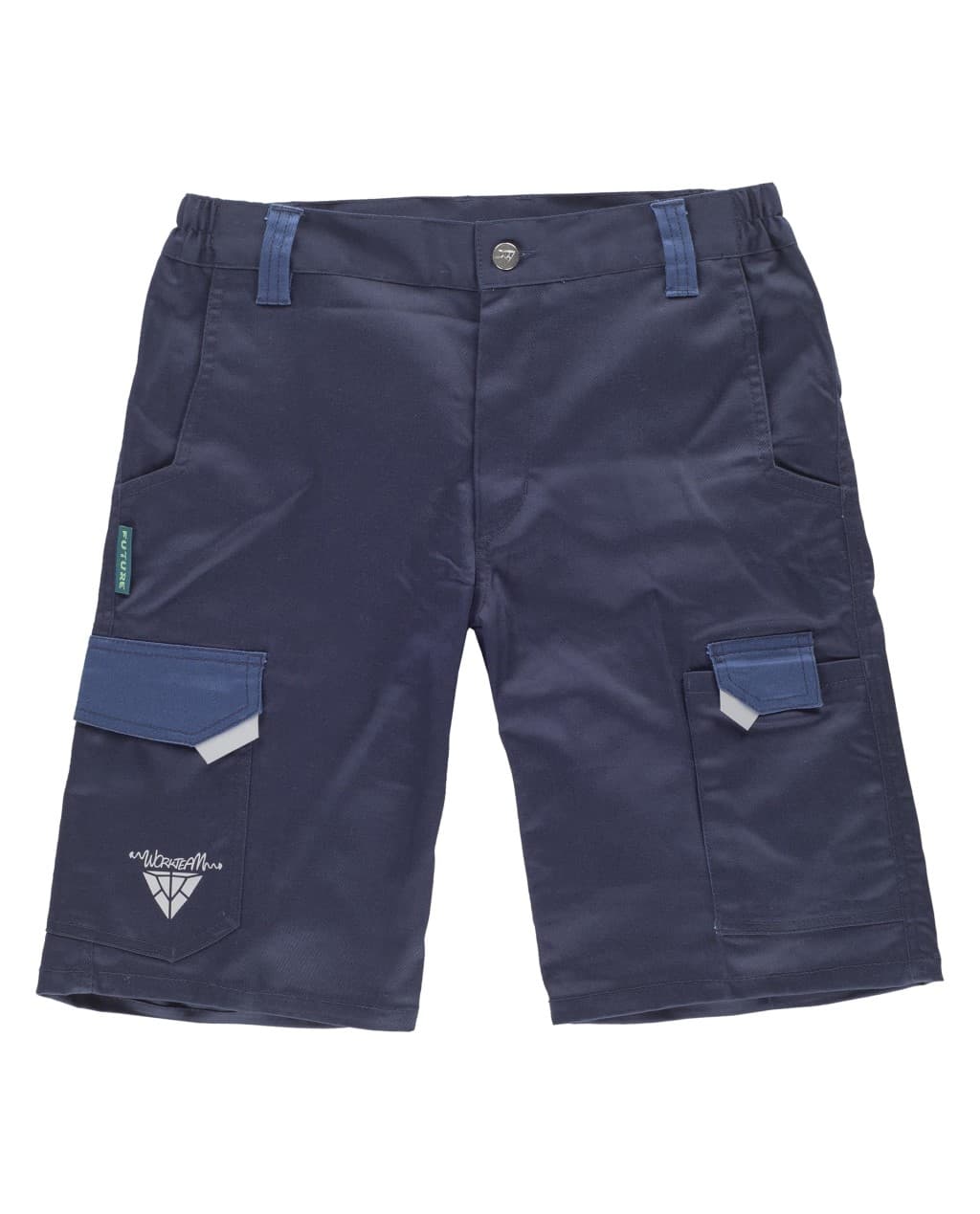 Bermuda de tejido elástico combinado. Dos bolsos de abertura inclinada en los costados y un bolso lateral de plastón y cartera de velcro. Dos bolsos traseros de plastón interiores y cartera de velcro. Un bolso de espátula con cartera de velcro en pernera. Refuerzo en culera. Elástico en los laterales de la cintura. Trabillas. Detalles reflectantes. Cierre de botón metálico y bragueta de cremallera.